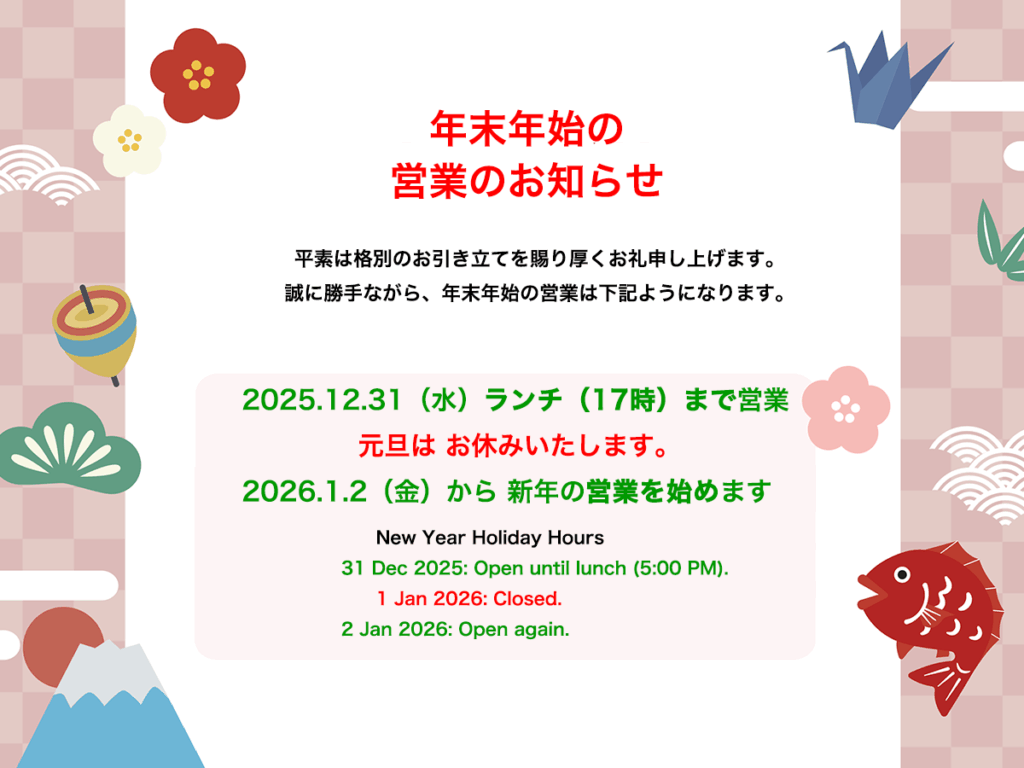 2025.12.31(水)ランチ(17時)まで営業いたします。